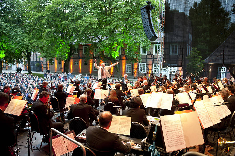 Music, theater, and dance performances were presented by cultural institutions at the 1st Biennale for Ostwestfalen-Lippe at Rheda Castle. Under the motto “LAND.SCHAFFT.KULTUR,” Theater Bielefeld and its Bielefeld Philharmonic, the Landestheater Detmold, Theater Paderborn, the Nordwestdeutsche Philharmonie (Herford), and the Hochschule für Musik Detmold transformed Schloss Rheda into a special festival venue with an extraordinary backdrop.