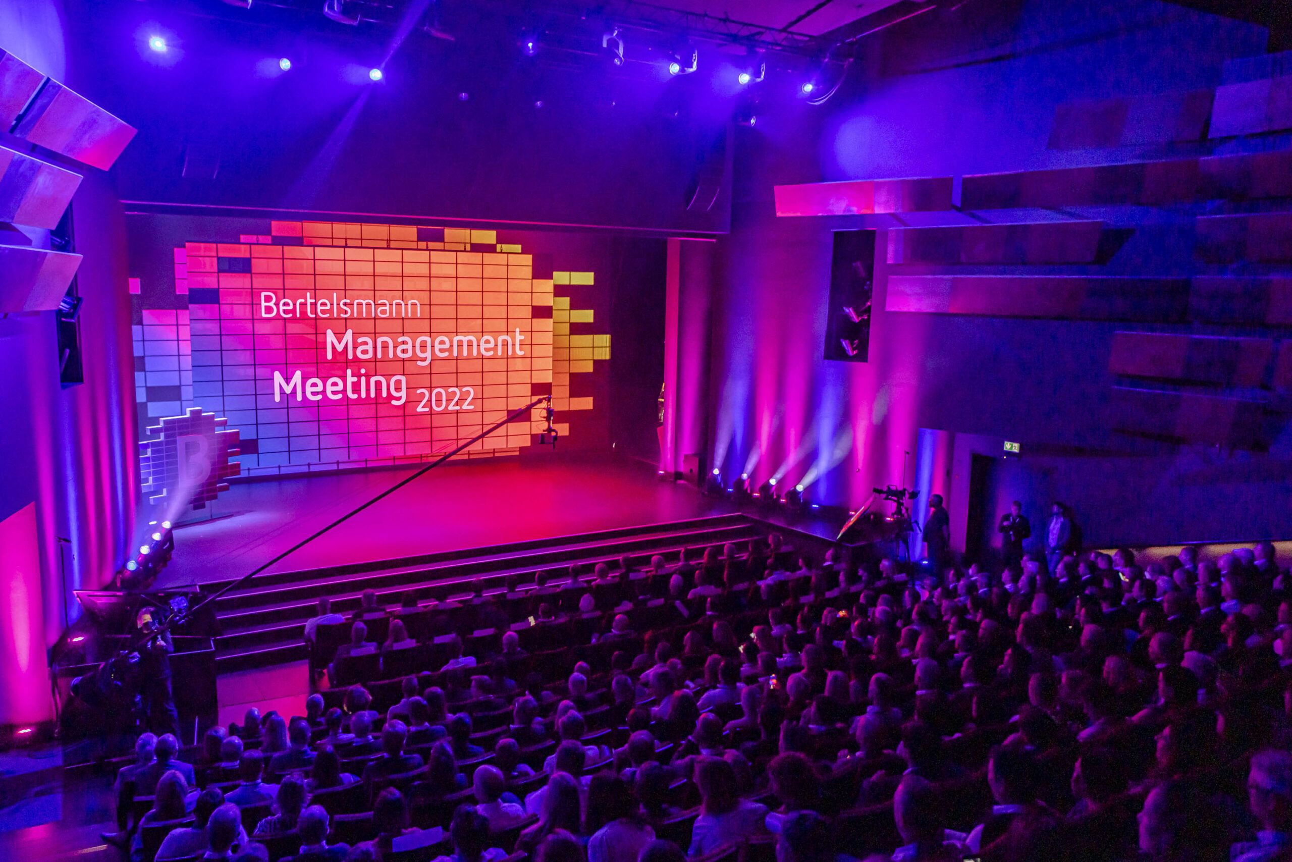 Seit 2001 organisieren wir, zunächst in Berlin, seit 2012 in Gütersloh, das internationale Management Meeting für Bertelsmann. Hier treffen sich im 2-3 Jahresrhythmus mehr als 500 Führungskräfte aus aller Welt auf Einladung des Vorstands. Themen sind die strategische Ausrichtung des Konzerns, neue Impulse für die jeweiligen Unternehmen und ein intensiver Austausch beim Networking. In den vergangenen Jahren fand die Konferenz im modernen, innovativen Gebäude des Theater Gütersloh statt. Flankiert wird die Konferenz von einem abendlichen Get together in kreativ einladender Atmosphäre.